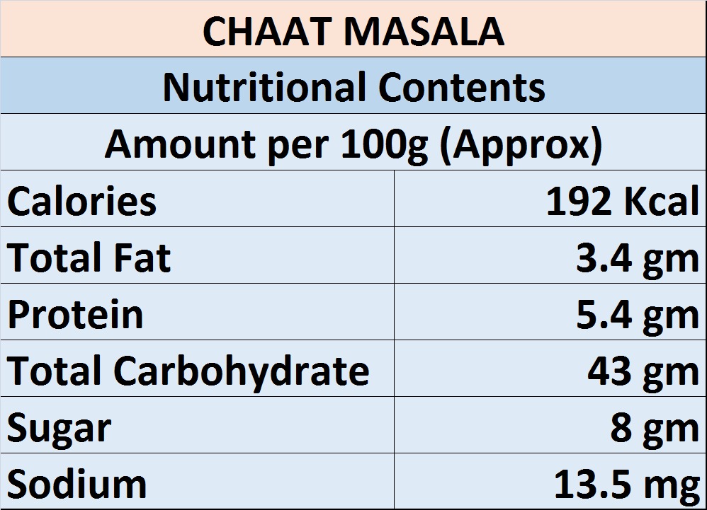 Ingredients:Amchur, Black Salt, Rock Salt, Sugar, Red Chilli, Cumin, Coriander, Ajwain, Black Pepper, Nutmeg, Cardamom, Cloves, Chinamon